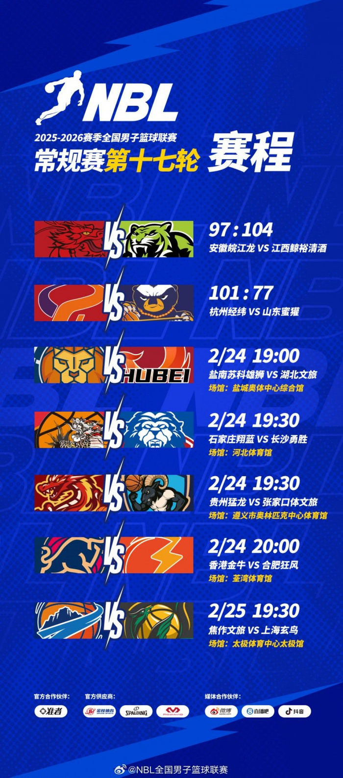 NBL常规赛第十七轮结束了首日较量 今天将进行四场比赛!