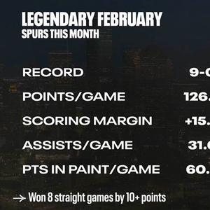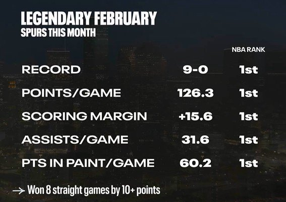 马刺2月至今全胜!场均得分&净胜分&助攻&禁区得分均联盟第一