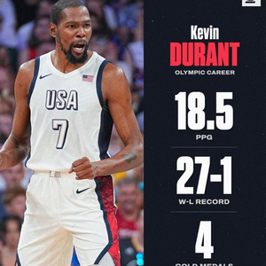 杜兰特生涯至今一共4次夺得奥运会金牌,在美国男篮的奥运战绩为27胜1负,场均能得到18.5分。