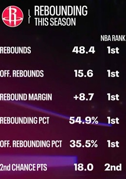火箭本赛季场均篮板&进攻篮板均联盟第1 二次进攻得分第2