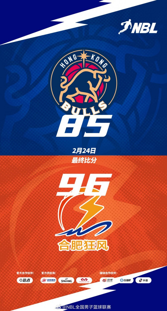 【战报】2025-2026赛季NBL联赛第13场焦点战:香港金牛加时赛85-96不敌合肥狂风。