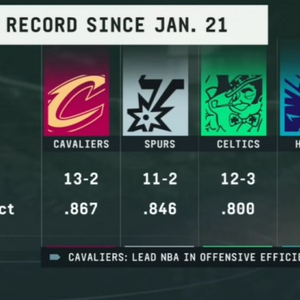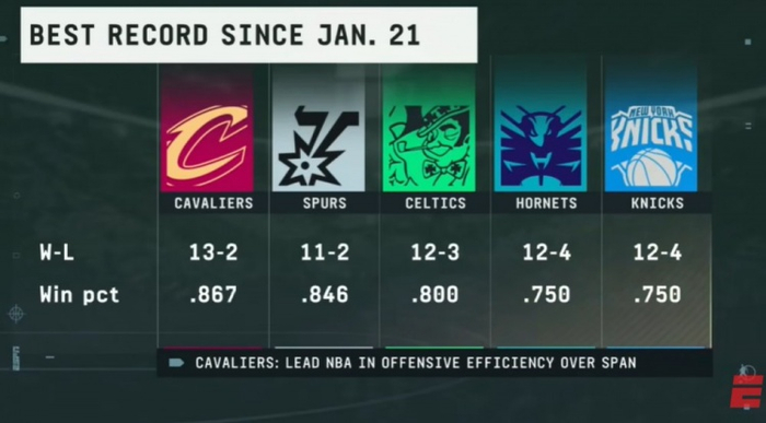 1月21日以来最佳战绩:骑士居首 马刺居次 绿军黄蜂尼克斯分列3-5