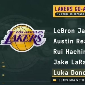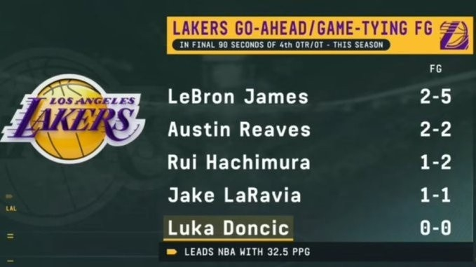 湖人最后90秒出手扳平或反超球:詹姆斯5中2小里2中2 东契奇0出手
