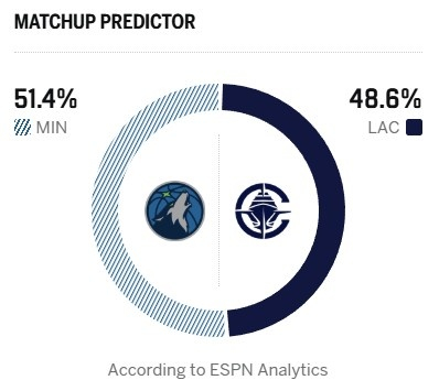 今日ESPN给出本场比赛胜率预测,森林狼51.4%略占上风,快船为48.6%。