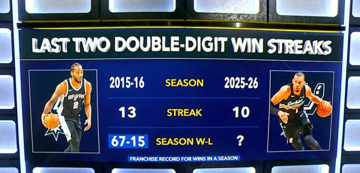 马刺上一次至少10连胜是2015-16赛季,他们曾豪取13连胜,常规赛战绩是队史最佳的67胜15负。今日过后,马刺战绩来到了42胜16负。