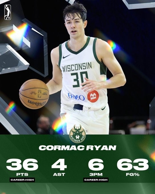 G联盟场均20.4分4.6板!Scotto:雄鹿已与科马克·瑞安签双向合同