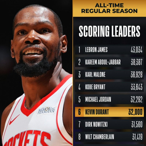 直播吧2月28日讯 昨日,杜兰特在战胜魔术的比赛中拿到生涯第32000分,目前排名历史得分榜第六。