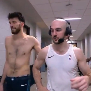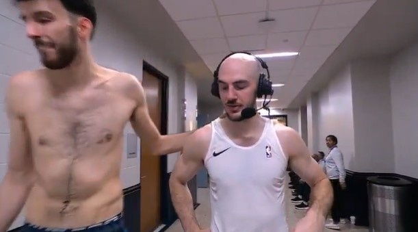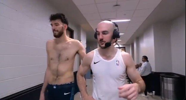 虽瘦但能抢板!卡鲁索赛后接受采访时切特经过 半裸排骨吸引眼球