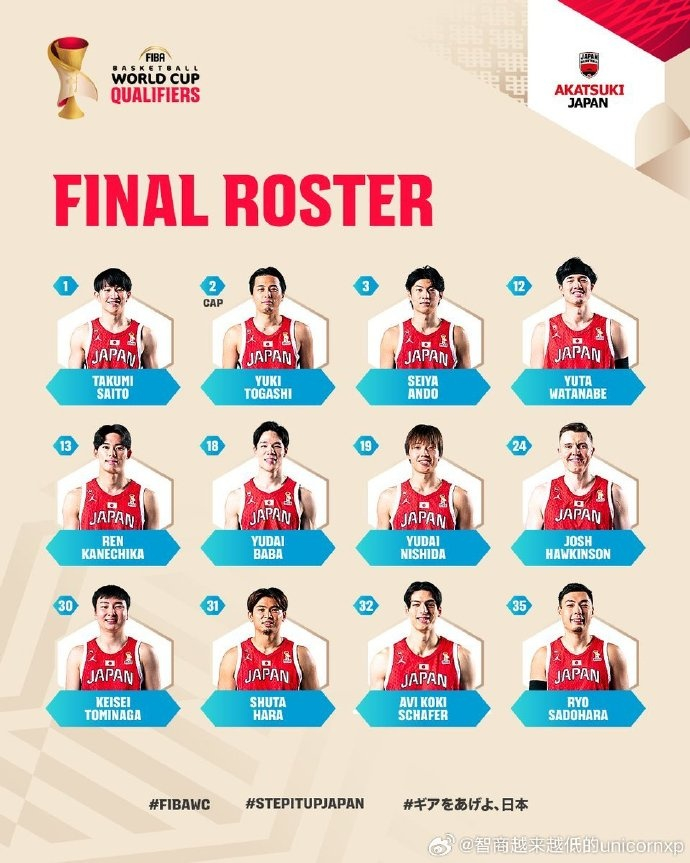 有变化!日本男篮对阵韩国12人大名单用霍金森替换科克