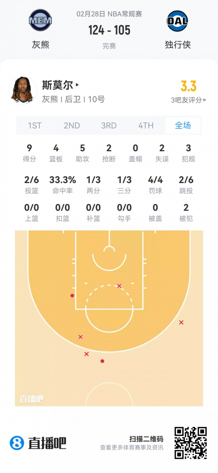 灰熊次轮48号秀斯莫尔 登场25.8分钟