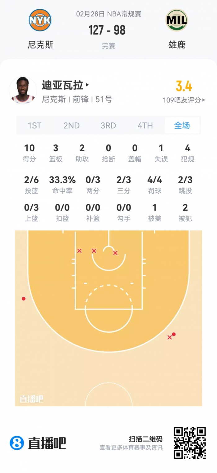 尼克斯次轮51号秀穆罕默德·迪亚瓦拉 登场22.7分钟