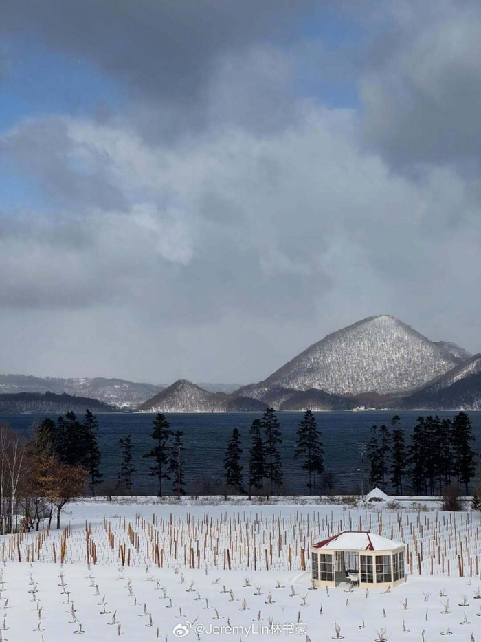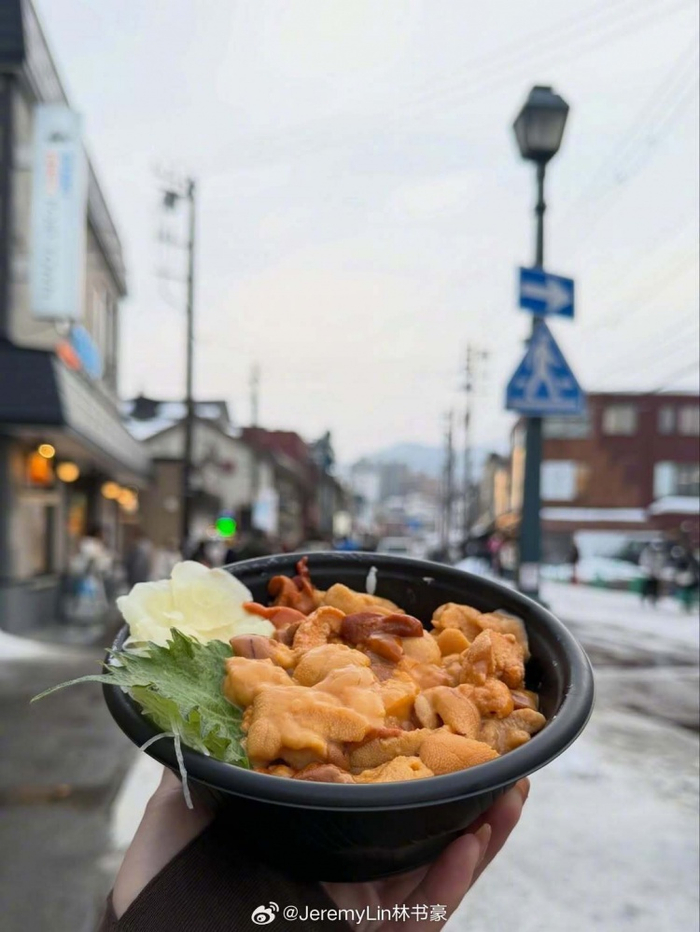 他写道:“儿子第一次看到雪❄️吃不完的海胆😋找各种各样的方式不让我打呼吵醒大家😂”
