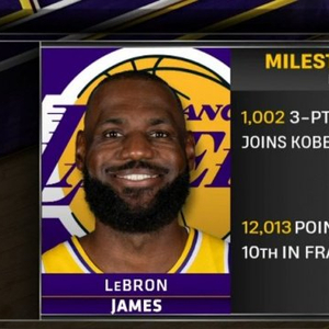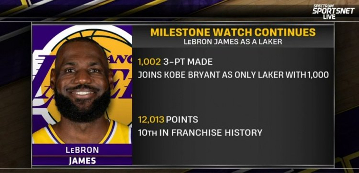 本场比赛,湖人球星詹姆斯命中4记三分球,他在湖人队已经命中1002记三分球,成为队史继科比之后第二位命中1000+三分球的球员。