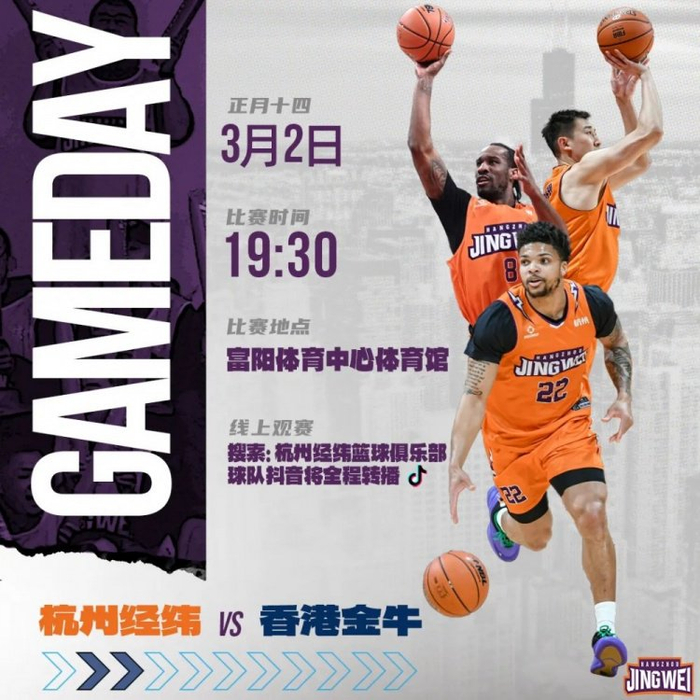2026年3月2日19:30,2025-2026赛季NBL联赛常规赛第19轮,杭州经纬将在主场迎战卫冕冠军香港金牛。