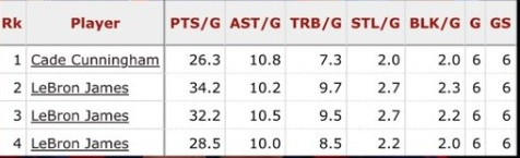 过去6场,坎宁安场均26.3分7.3板10.8助2断2帽,历史第二位能在6场比赛区间打出场均25分5板10助2断2帽,此前仅詹姆斯做到,他做到3次。