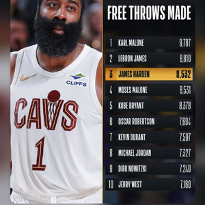 本场比赛过后,哈登生涯总罚球命中数来到8535个,超越摩西·马龙(8531个)升至历史第3,排在第2的是詹姆斯(8810个)。