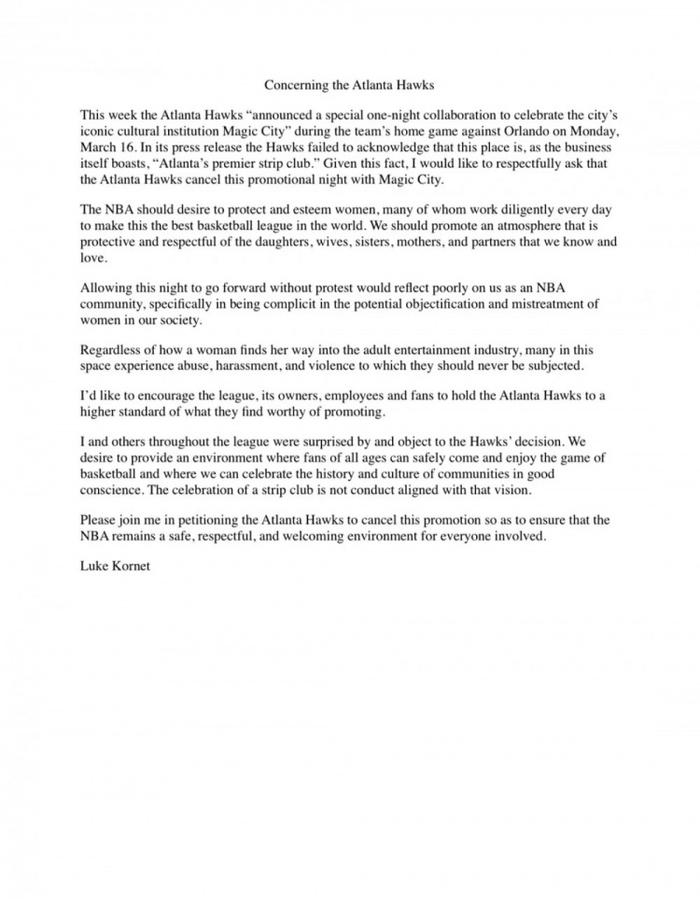 本周,亚特兰大老鹰队“宣布了一项特别的合作之夜,以庆祝该市标志性文化机构Magic City”,此次活动将在球队3月16日周一主场对阵奥兰多魔术队的比赛中进行。在其新闻稿中,老鹰队未能承认这个地方,正如该商家自己所标榜的那样,他们是“亚特兰大首屈一指的脱衣舞俱乐部”。鉴于此事实,我谨诚挚地请求亚特兰大老鹰队取消与Magic City的这个推广之夜。