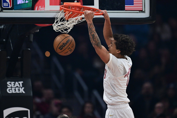 在重新拉到底角后,波特左手运球冲击底线,过掉哈里斯,迎着斯图尔特起跳双手将球扣进。他在篮筐上多挂了一会儿,低头看着这位禁赛7场后首度复出的内线球员。