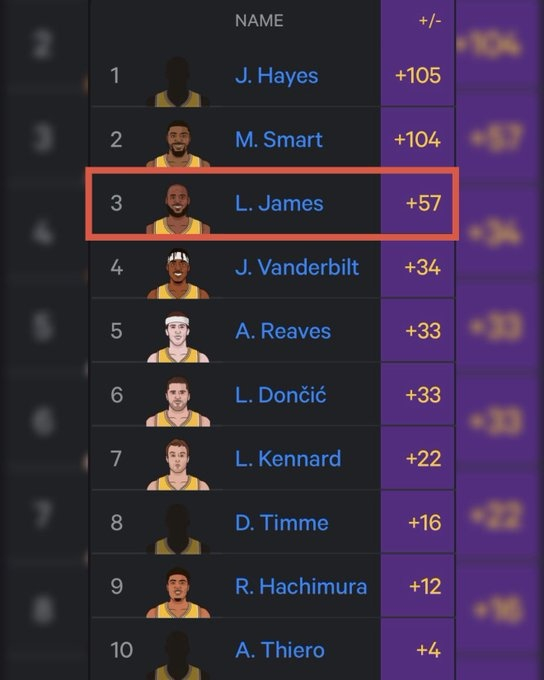 湖人球员自26年以来正负值:海斯+105领跑 詹姆斯+57第3 卢卡第5