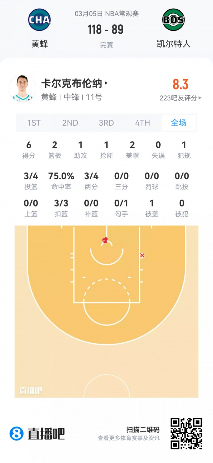 黄蜂次轮34号秀卡尔克布伦纳 登场14.3分钟