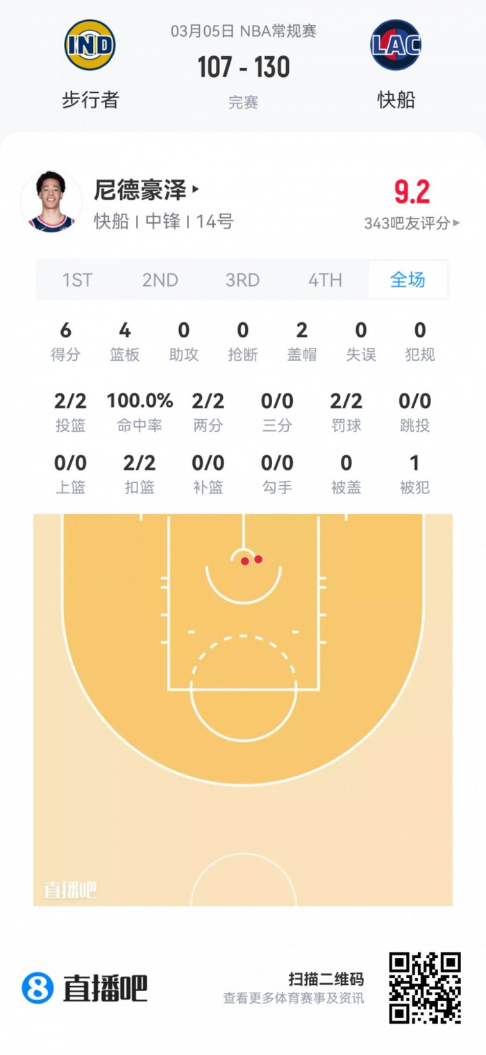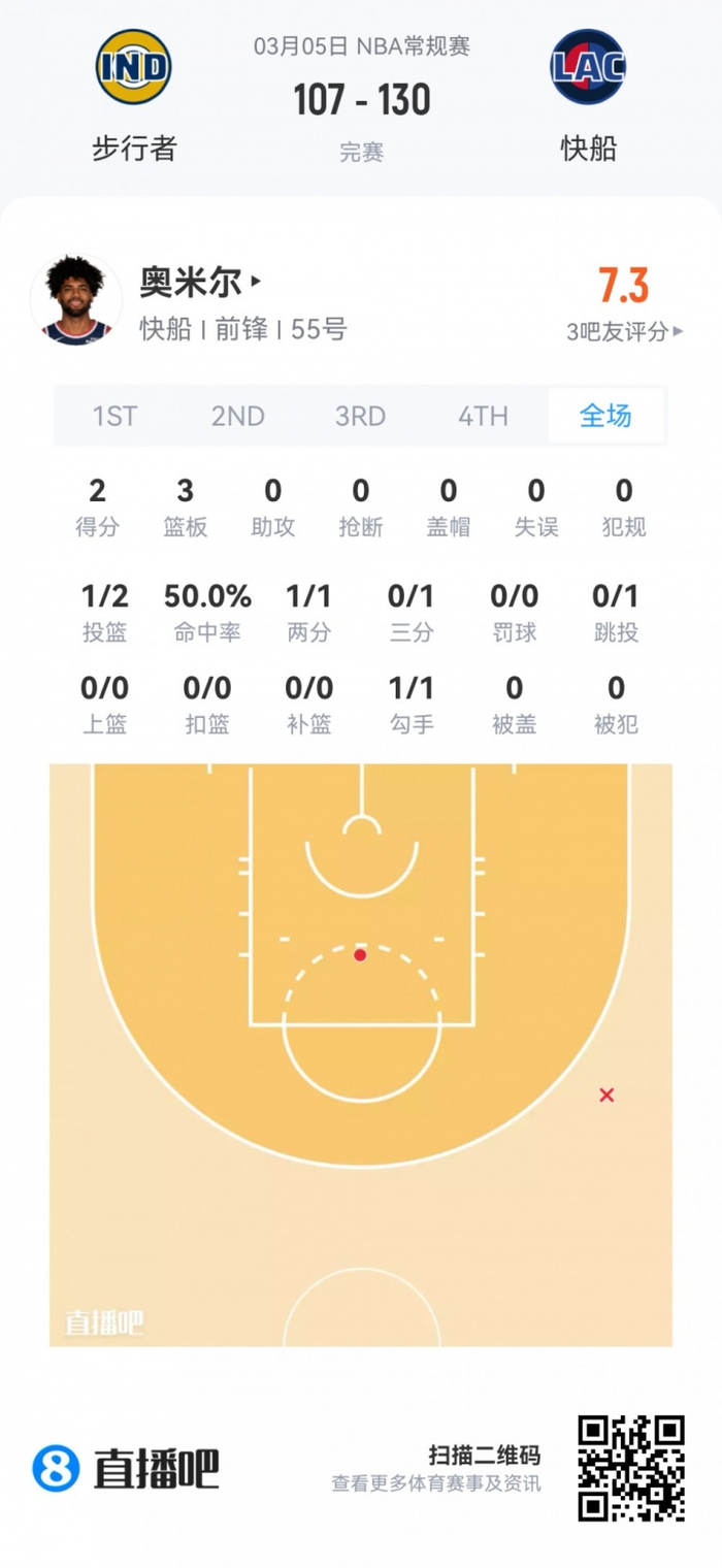 快船落选秀诺恰德·奥米尔 登场5分钟