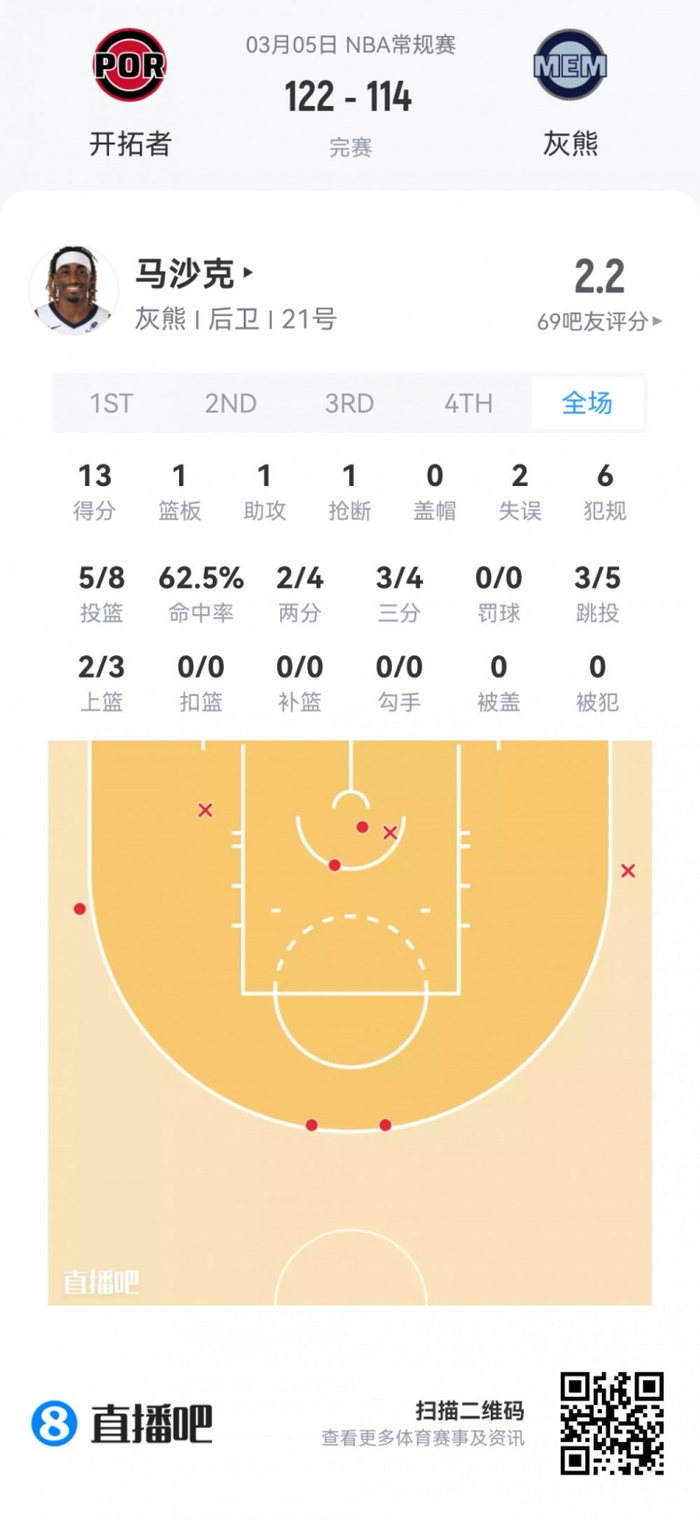 灰熊次轮59号秀马沙克 登场21.3分钟