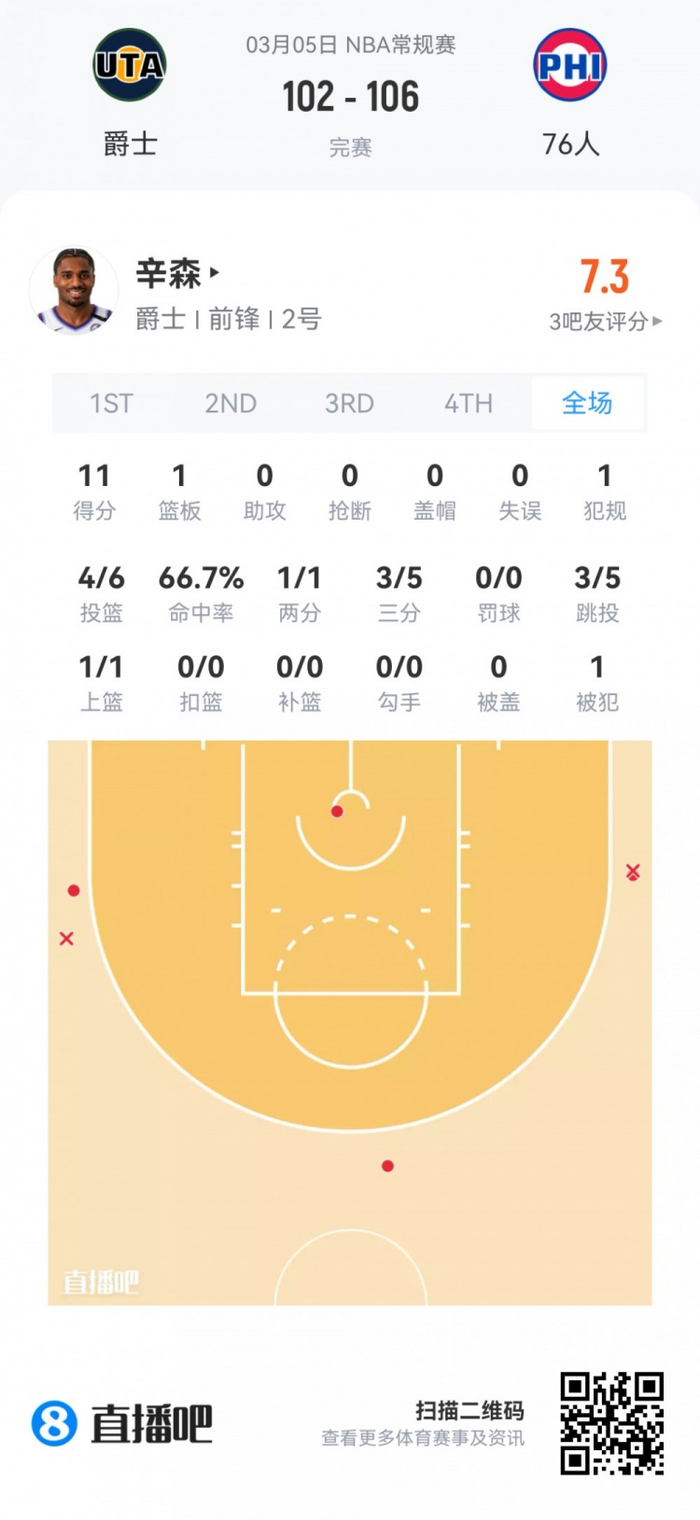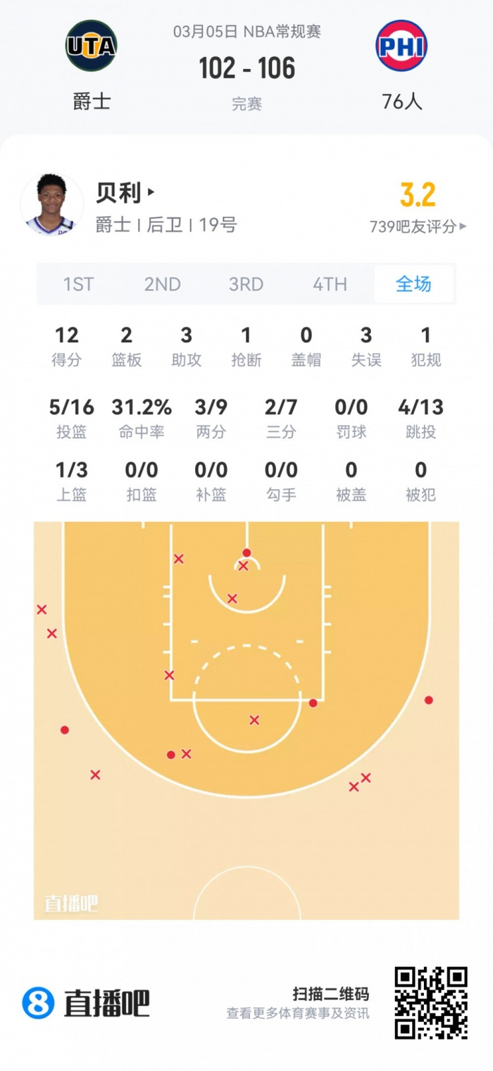 爵士首轮5号秀埃斯·贝利 登场30.5分钟