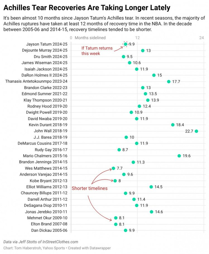 直播吧3月5日讯 雅虎体育记者Tom Haberstroh今日晒出一份球星跟腱撕裂(断裂)伤病的恢复数据。