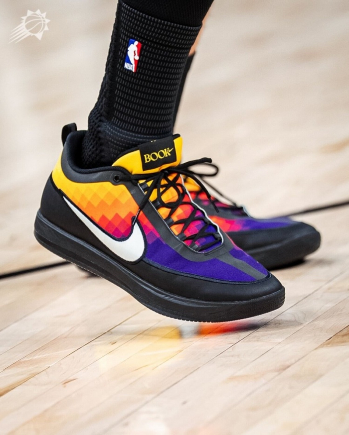 球队晒出了赛前布克热身的画面,还有他脚上新配色球鞋的特写。这双球鞋是Book 2 “The Valley”配色。以球队城市版球衣为灵感。
