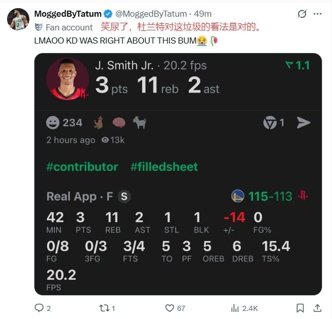 输残阵勇士!火蜜:为自己是杜兰特球迷感到羞耻 卖申京 小贾真拉