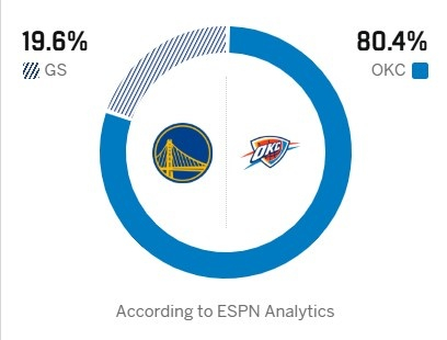 ESPN预测本场比赛胜率:勇士19.6%,雷霆80.4%。