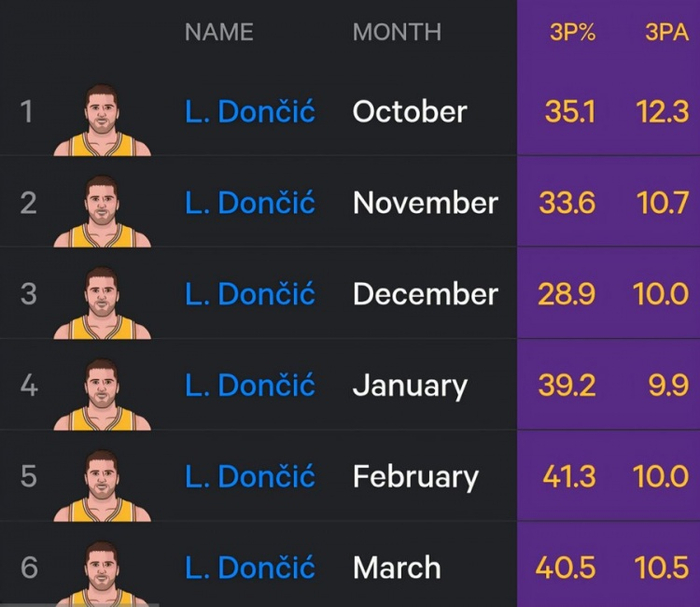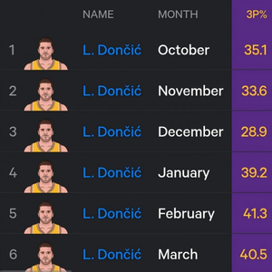 东契奇本季各月三分命中率:12月仅28.9% 近三个月稳定在40%