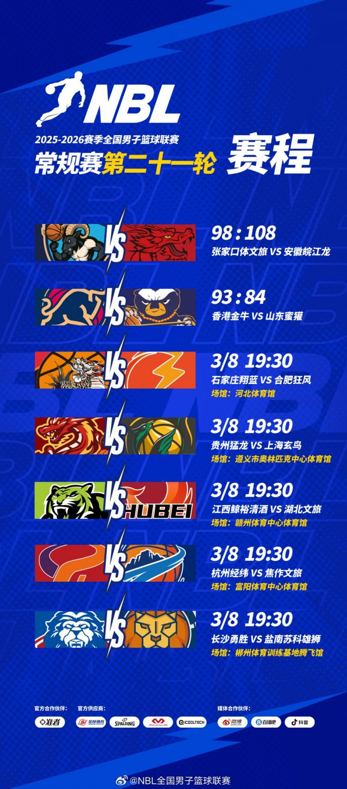 NBL常规赛第二十一轮第二个比赛日,张家口体文旅主场不敌安徽皖江龙;香港金牛主场战胜山东蜜獾。今晚将进行本轮剩余五场对决。