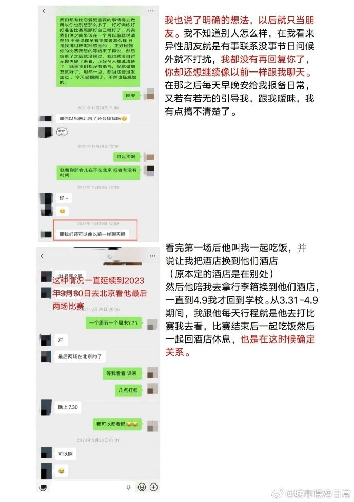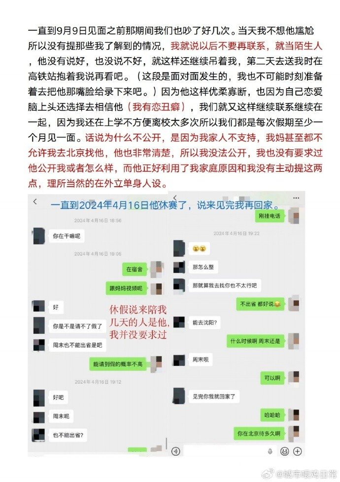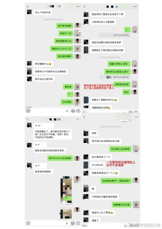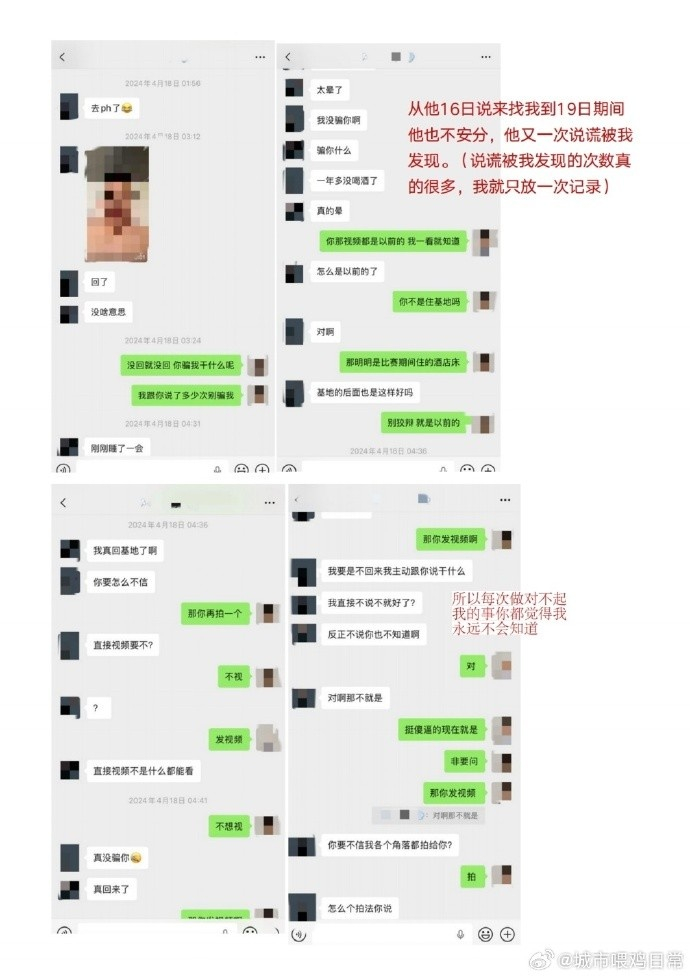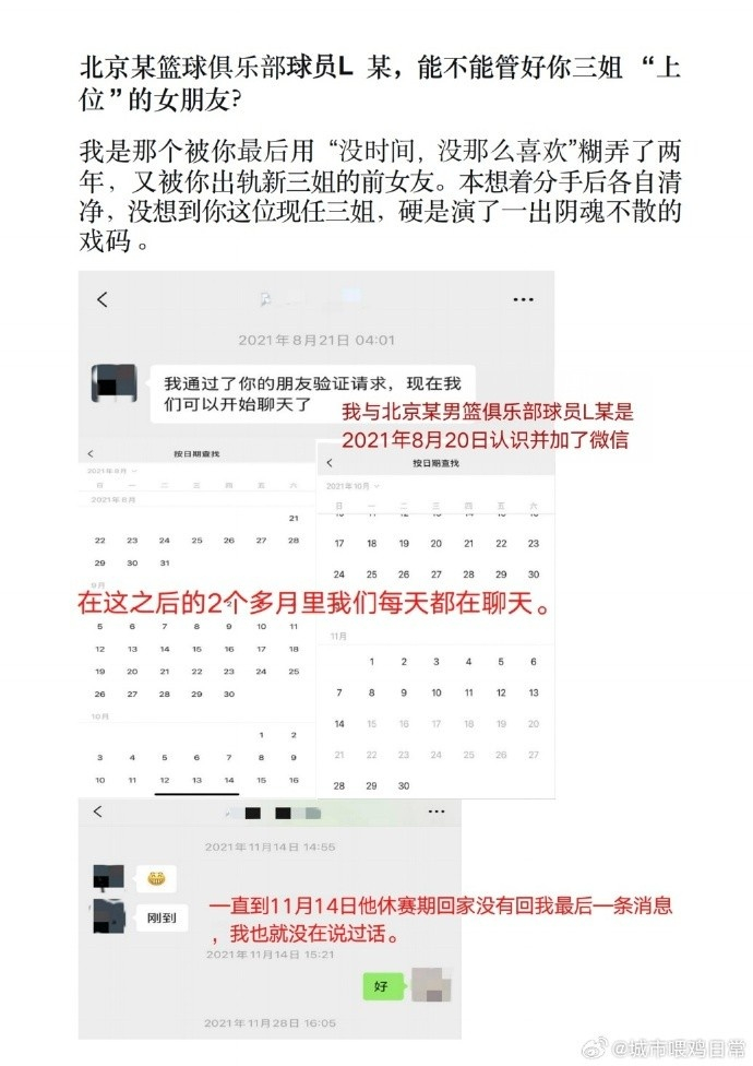 直播吧3月9日讯 此前,网名@城市喂鸡日常晒出多张图片,表示北京某篮球俱乐部的球员L某劈腿,还被这位L某的小三骚扰。