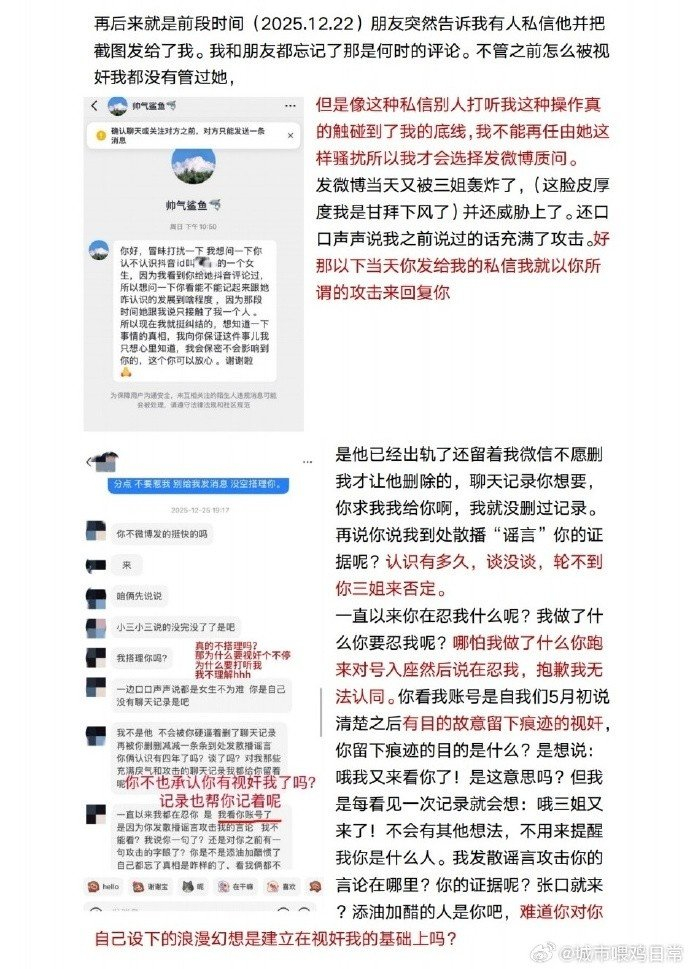 @城市喂鸡日常晒出多张与L某小三的聊天纪录截图,并写道:“《臆想症三姐篇》”,详见下图: