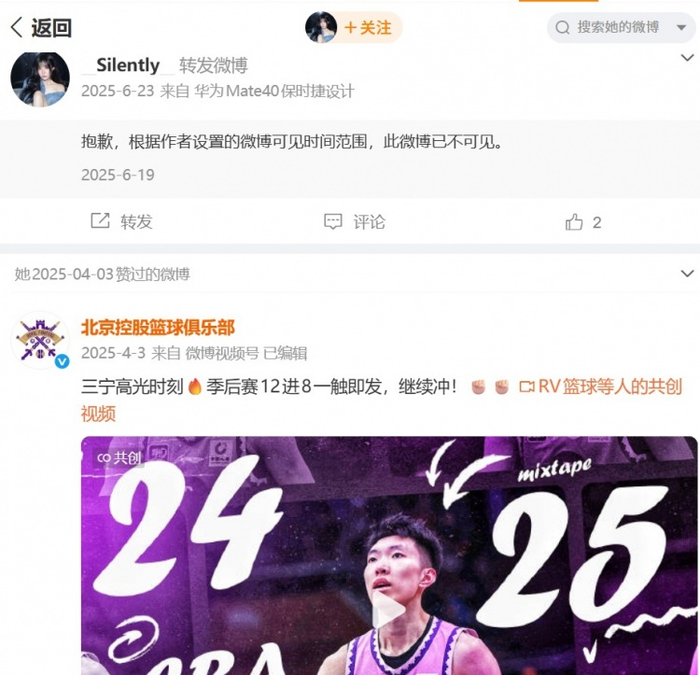 关注列表里仅有廖三宁!某网友:北京球员L某劈腿 我还被小三骚扰