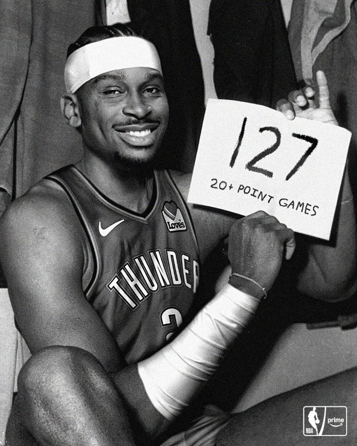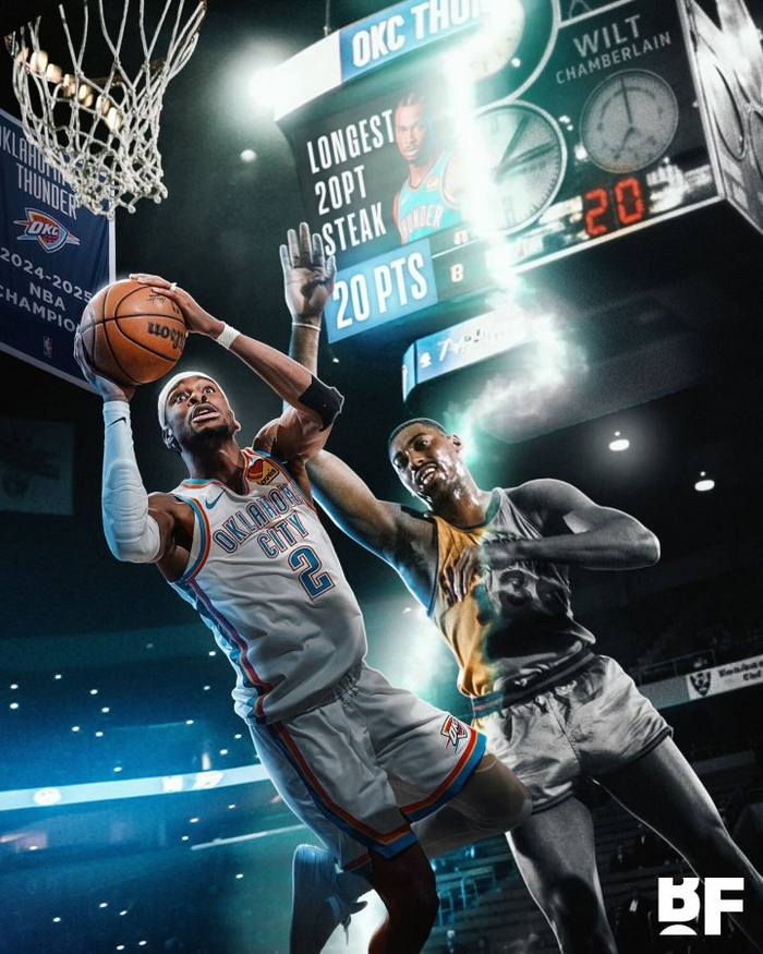 这样,亚历山大连续127场至少20分,正式超越1961-63赛季的张伯伦(126场),登顶NBA历史第一。