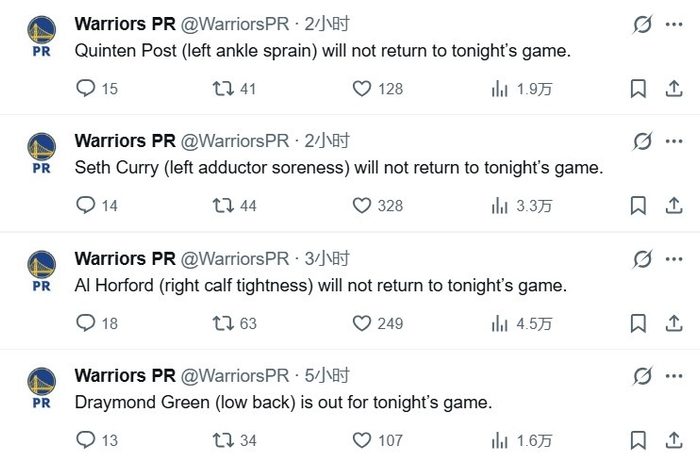 本场比赛勇士赛中三人伤退,分别是霍福德(左小腿肌肉)、小库里(左腿内收肌)和波斯特(左脚踝扭伤)。而在比赛开始前半个小时,追梦格林因为下背部疼痛确定缺阵。