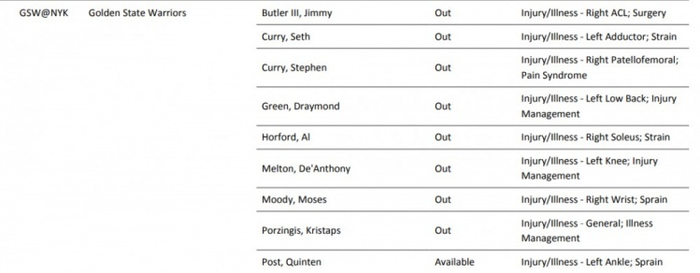 勇士今日伤兵满营,库里、巴特勒、 波尔津吉斯、梅尔顿、穆迪、追梦、霍福德和赛斯·库里8名大将全部缺战。
