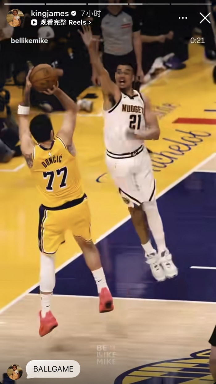 詹姆斯也转发了东契奇在加时赛命中的绝杀球片段,并写道:“绝杀。”