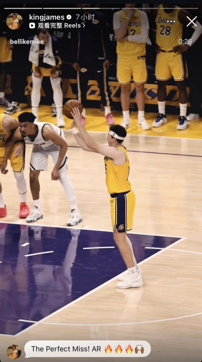 詹姆斯转发了里夫斯在昨日险胜掘金的比赛中最后时刻故意罚球不中随后抢到篮板投进绝平球的片段,并评论道:“完美的罚丢!AR🔥🔥🔥🙌🏾”