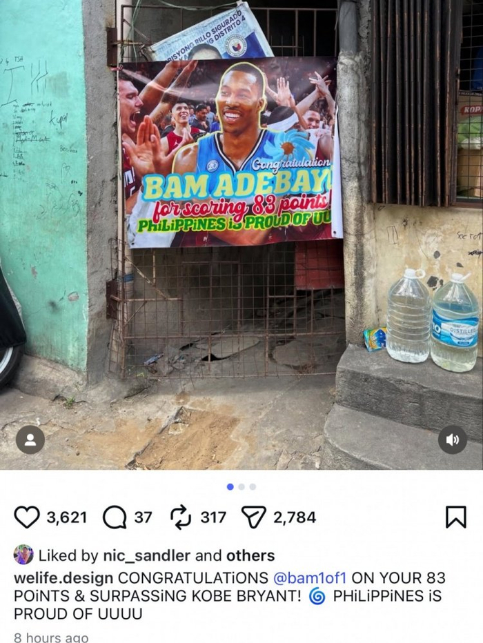 霍华德社媒晒出的照片中,菲律宾球迷庆祝阿德巴约拿到83分,但是用的是霍华德的照片。霍华德还晒出了一张两人照片对比。