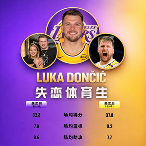 自从东契奇未婚妻在个人社媒移除二人相关合照以来。东契奇过去的6场比赛带领湖人取得6连胜,在此期间他场均能轰下37.8分9.2板7.7助2.2断1.2帽,场均正负值+10,投篮命中率48.7%,三分40.2%,罚球81.6%。他还获得了上周的周最佳球员。
