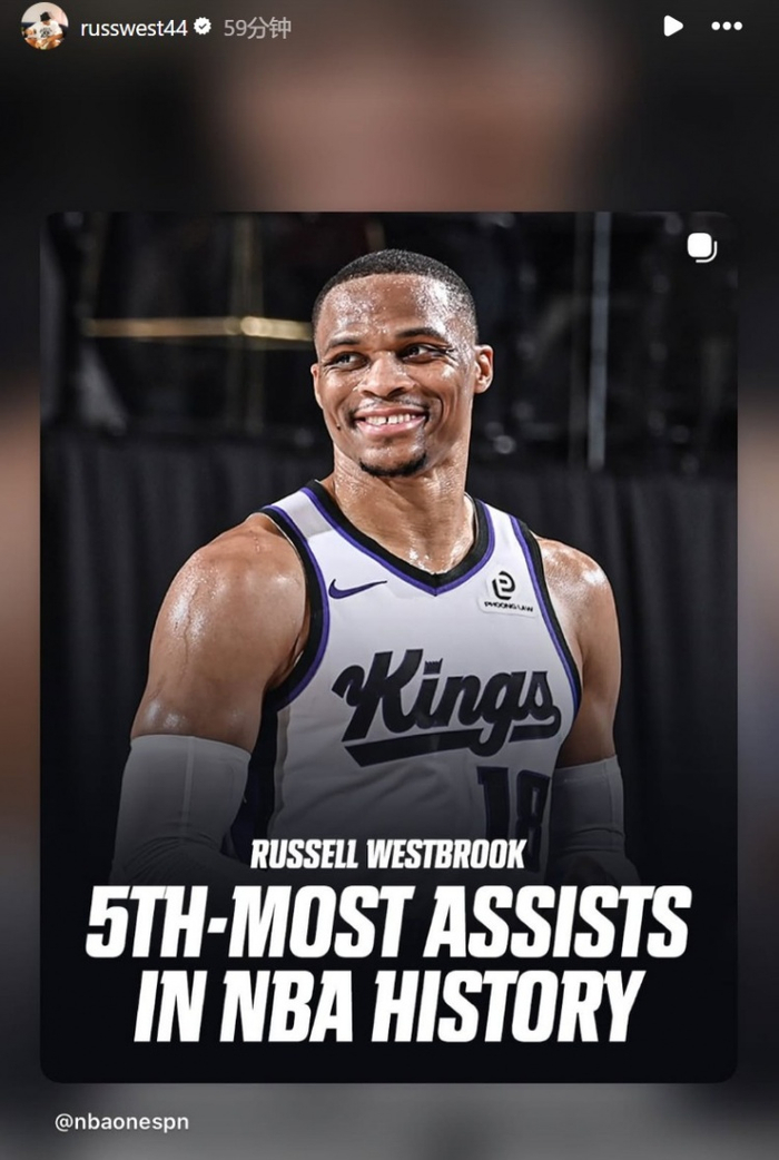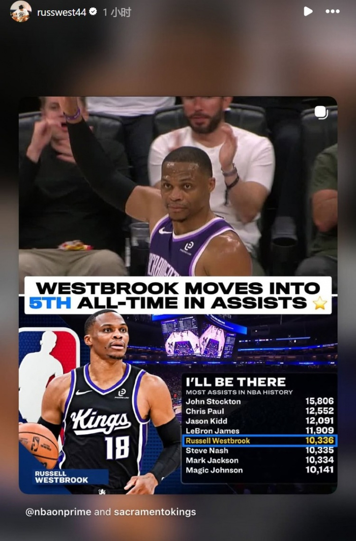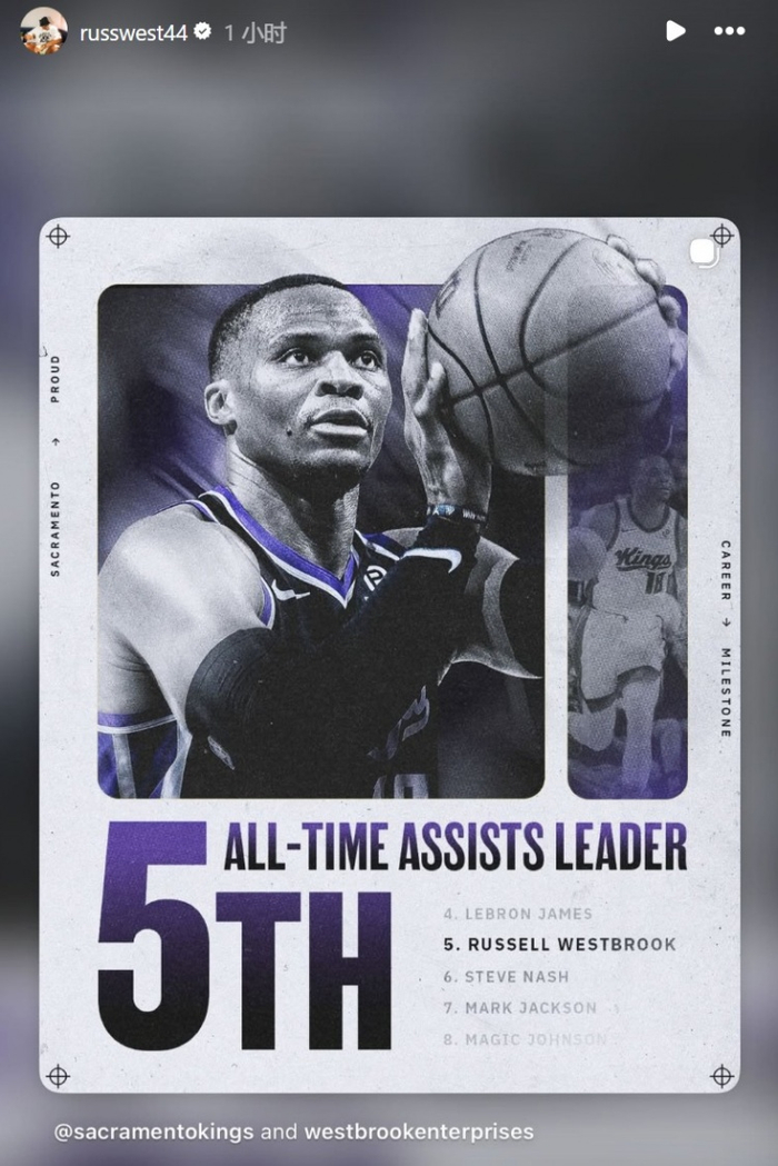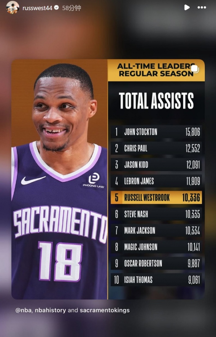 生涯助攻总数连超马克·杰克逊&纳什 上升至历史第五位!威少转发