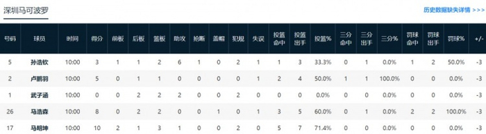 深圳:马明坤10分3篮板1助攻,马浩森8分2篮板1盖帽。