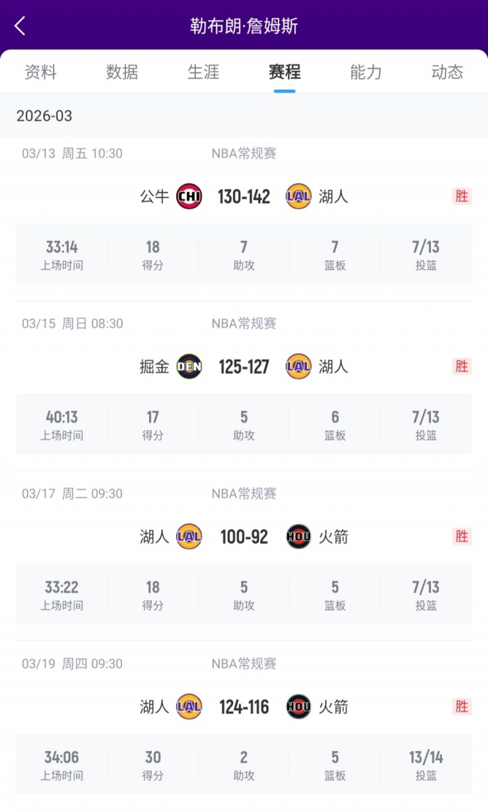 还能说啥!湖人七连胜期间詹姆斯出战4场全胜且出手均不超过15次