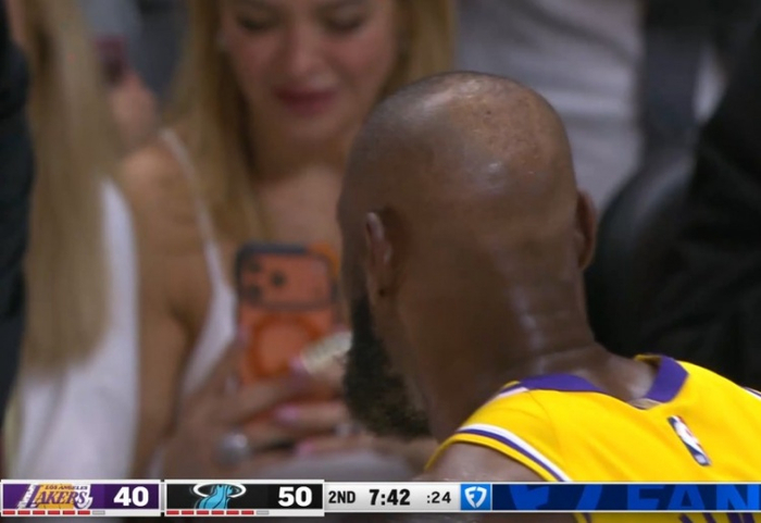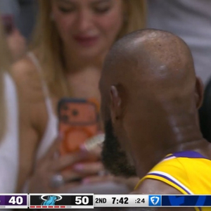 抓紧拍下来!詹姆斯在场边咬牙套调整 场边女球迷拿起手机拍摄