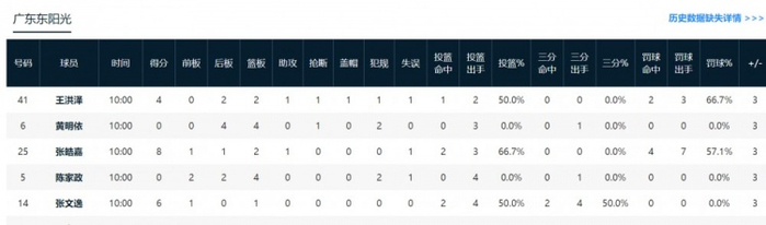 广东:张皓嘉8分2篮板1助攻,张文逸6分1篮板。