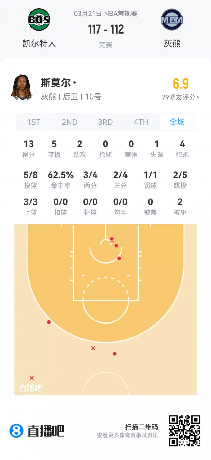 灰熊次轮48号秀斯莫尔 登场26.5分钟
