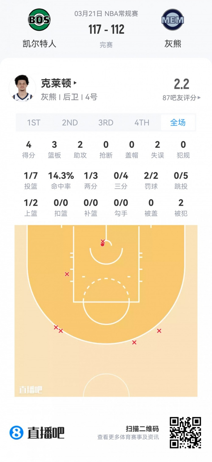 灰熊首轮18号秀小克莱顿 登场26.5分钟